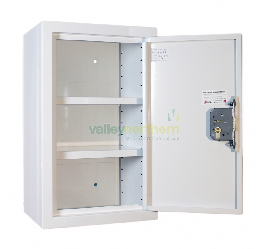 Discover unparalleled security with our Controlled Drugs Cabinet, featuring dimensions of 550mm x 335mm x 270mm. Easily wall-fixed with supplied anchors, it includes 2 adjustable shelves, single-point locking with a robust six-pin Euro-profile cylinder lock (3 keys), and meets the Misuse of Drugs Act, BS2881:1989, and BS3621 standards.