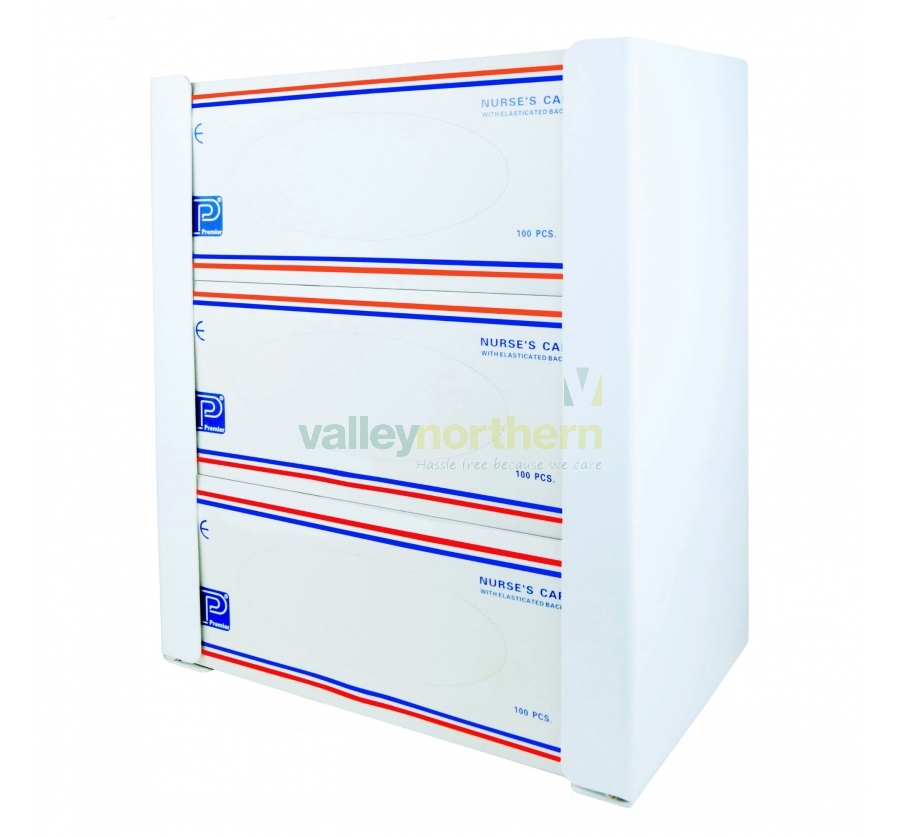 - Holds 3 x boxes Premier Nurses Caps Ref: 2916 or similar. Maximum box size: 333(W) x 187(D) x 140(H)mm. Please note that the dimensions are based on the cap aperture forward facing (see also our 1 box version NCD1-1-BIO).