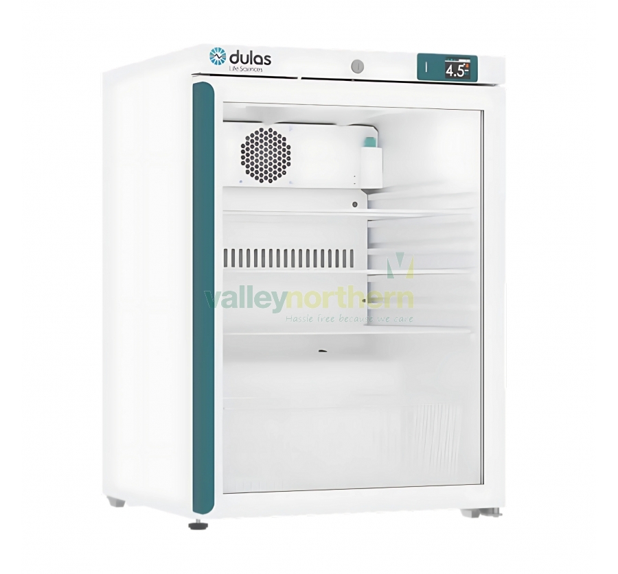Measuring (H) 850mm x (W) 595mm x (D) 650mm, the Dulas Glass Door Pharmacy Fridge is compact yet spacious, fitting seamlessly into professional workspaces.