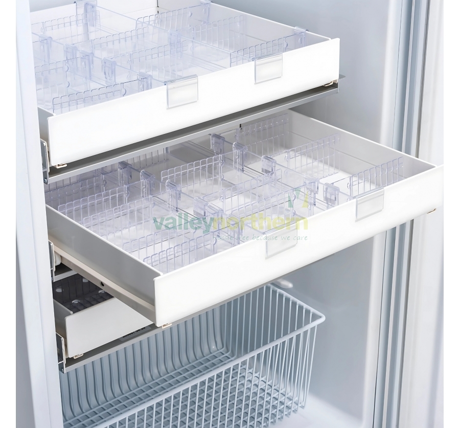 Organization is made simple with integrated slide-out drawers featuring dividers, which facilitate efficient stock rotation and keep contents neatly arranged. The fridge also includes four shelves with three fixed positions and one basket, maximizing storage space and accessibility.