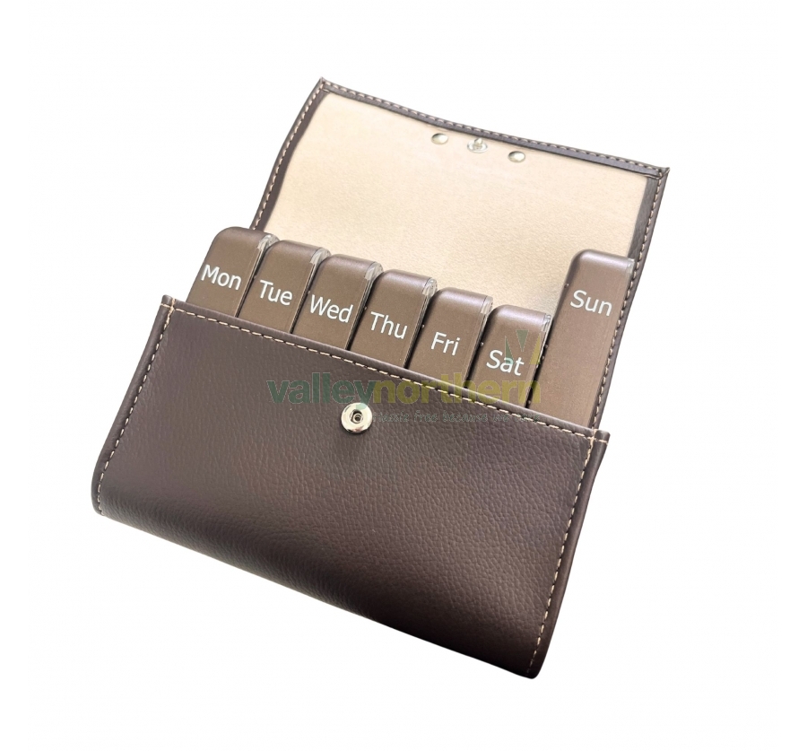 Designed for both elegance and functionality, the Luxury Pill Dispenser offers a refined solution for managing complex medication routines. Encased in a sophisticated brown leather exterior, it combines discreet style with practical features?making it ideal for daily use at home, in clinical settings, or while travelling.