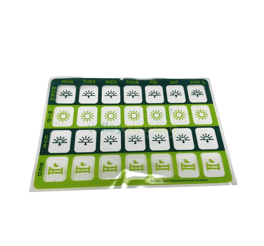 Enhance your medication management with Pharmasafe™ Extra Seals, specially designed for use with PTT250 Tablet Trays. Organize your regimen effortlessly with these seals, accommodating 7 days divided into 4 convenient sections for each day. No assembly equipment is needed; simply peel and apply for immediate use. Elevating hygiene standards, these seals eliminate contamination risks.