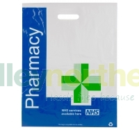 Easily identifiable, these bags have a lime green banding on the front and feature the trusted Pharmacy logo. Down the side of the bag, Pharmacy is printed in white font and the NHS logo is situated along the bottom. On the rear of the bag are the environmental features of the packaging along with patient advice panels and a designated area to affix labels.