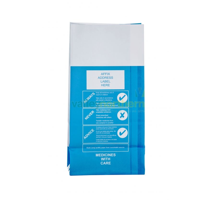 For streamlined reordering, the product code is printed on the base, simplifying inventory management. The bags feature advice panels to remind patients of essential safety measures when handling medicines, promoting responsible usage.