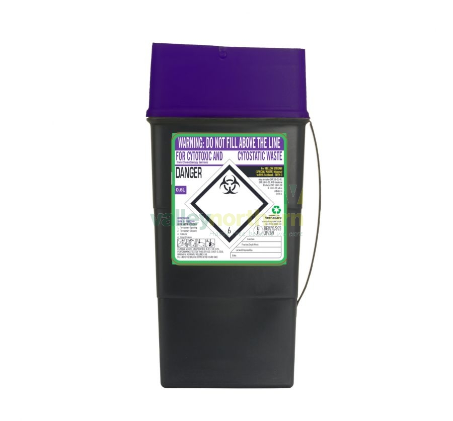 With a capacity of 0.6L, this bin is tailored for smaller quantities of cytotoxic waste. The moulded lid offers both temporary and permanent closure options, ensuring flexibility in disposal procedures. The integrated carry handle enhances portability for convenient waste collection.