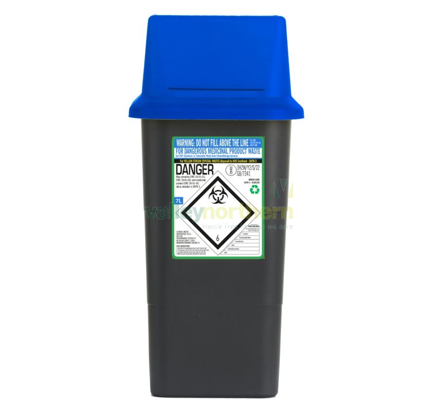 Crafted with functionality and safety in mind, the Sharpsafe™ Scotland Sharps Bin boasts a distinguished grey base paired with a blue lid, easily setting it apart and signifying its purpose for the disposal of contaminated medicinal products.