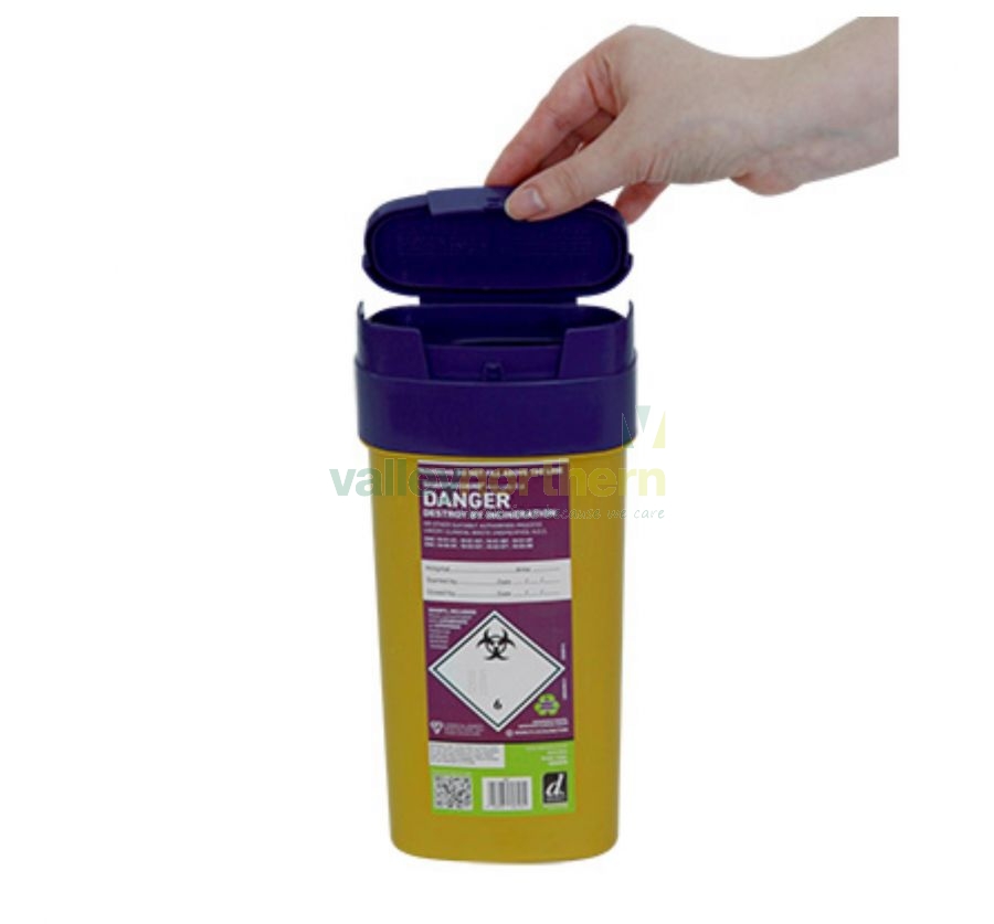 - Purple lid and deep yellow base, in line with HTM 07-01 waste segregation guidance