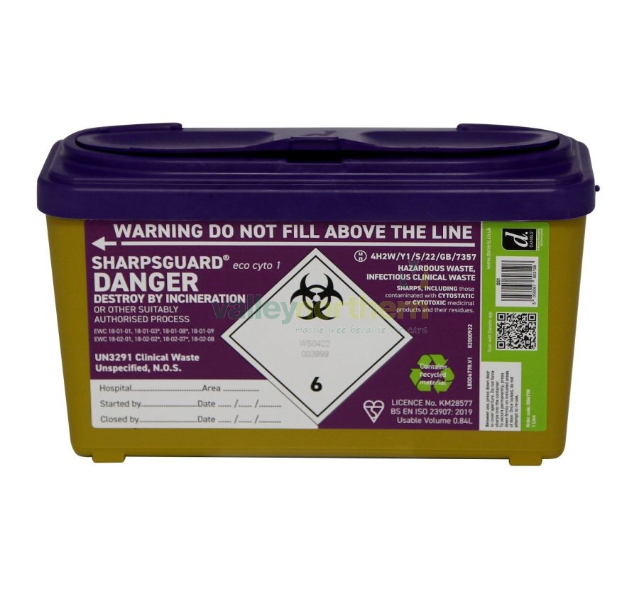 - Deep yellow base with purple lid, in line with HTM 07-01 waste segregation guidance