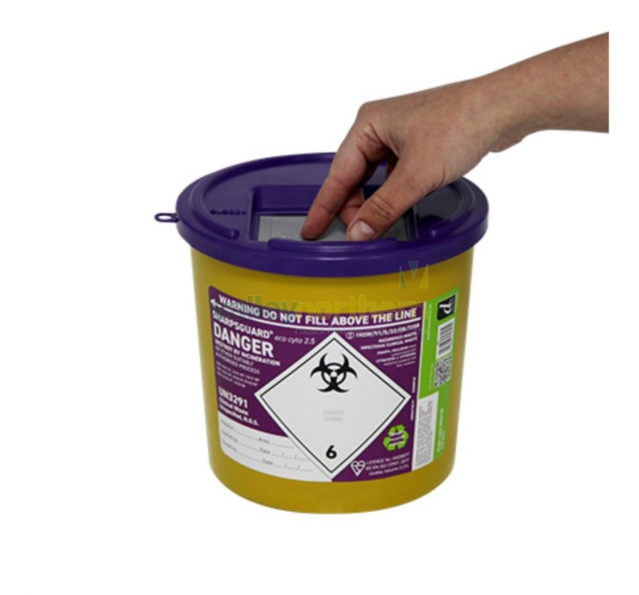 - Dark yellow base with purple lid, in line with HTM 07-01 waste segregation guidance
