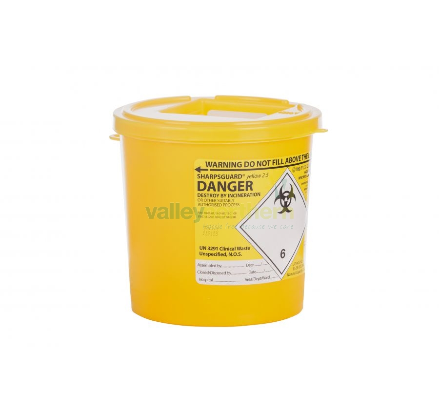 Discover the Sharpsguard™ Sharps Bins With Yellow Lid - 2.5 Litre, a trusted answer to safely disposing of contaminated sharps. Engineered for simplicity, safety, and efficiency, it guarantees exceptional defense against penetrating sharps and fluid leaks. Aligned with UN 3291 and ISO 23907-1:2019 standards, it upholds optimal safety benchmarks. Boasting a 2.5-litre capacity, it offers a compact yet efficient solution. This bin is part of a size assortment tailored to your specific requirements. Opt for Sharpsguard™ to seamlessly manage sharps disposal in full compliance, fostering confidence for both you and your surroundings.