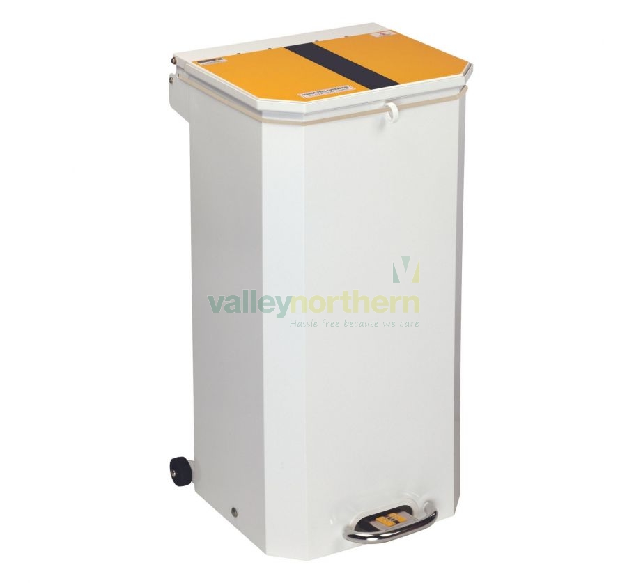 The Yellow Stripe Soft Close Metal Clinical Pedal Bin - 70L, a top-tier solution for offensive and hygiene waste disposal in healthcare settings. Its vibrant yellow lid with a striking black stripe ensures easy identification, while the hands-free foot pedal operation promotes a hygienic environment. This clinical bin complies with safe healthcare waste management standards, adhering to HTM05-03 Part A guidelines. Its silent, dampened closing lid prevents disturbances, and the corrosion-resistant epoxy coating ensures durability. The bin's silicone bag retaining cord with a nylon finger loop secures waste bags effectively, while the sealed base prevents leaks. With an integrated wall bracket and flame-retardant design, this clinical pedal bin is easy to clean, making it a reliable and indispensable asset for any medical facility.